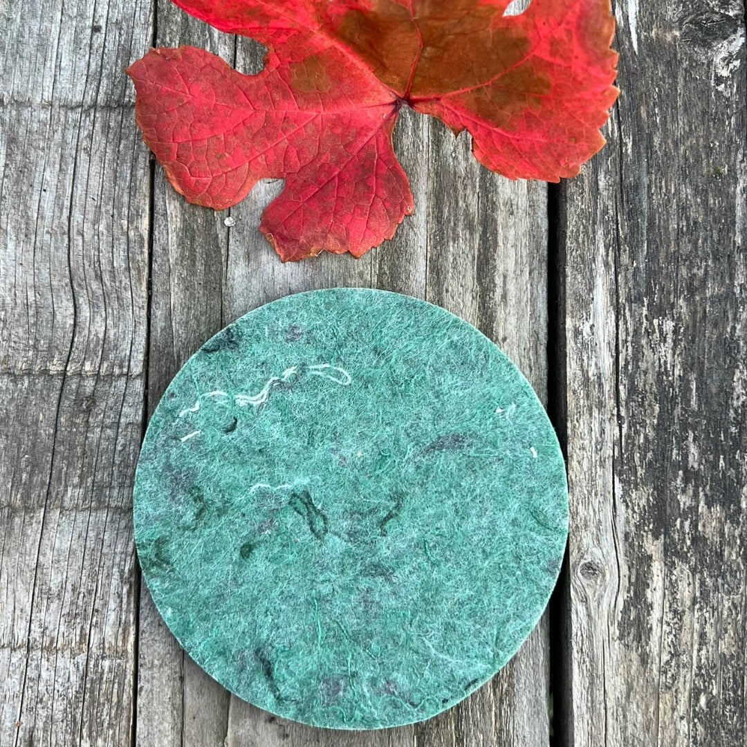 Tyylikäs ja kestävä lasinalunen, joka on valmistettu kierrätyskuidusta, jokaisella alusella on oma tarinansa. Vihreä huopa on tehty käytöstä poistetuista teollisuuden työvaatteista ja grafiitinharmaa kierrätetystä pet-muovista, kuten muovipulloista.